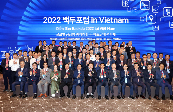 ▲ 중소기업중앙회가 베트남 상공회의소(VCCI)와 공동으로 `2022 백두포럼` 을 개최해 참석자들과 기념촬영을 하고 있다.중소기업중앙회(회장 김기문)는 베트남 상공회의소(VCCI)와 공동으로 ‘2022 백두포럼’을 8일 신라 모노그램 꽝남 다낭에서 개최했다고 밝혔다.