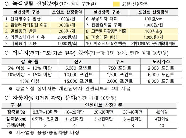 에너지 절약, 자동차 주행거리 절감량에 따라 각각 최대 10만 원, 녹색생활 실천 시 최대 7만 원을 받을 수 있으므로, 일상 속 저탄소 생활 활동으로 1인당 연간 최대 27만 원의 경제적 혜택을 얻을 수 있다.