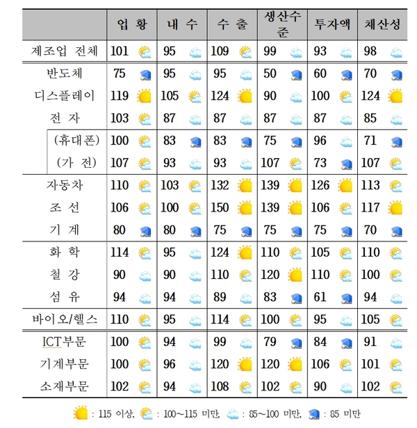 세부 업종별 업환을 살펴보면 △자동차 119 △조선 111 △바이오·헬스 105로 이 업종만이 100을 상회하고 △반도체 60 △가전 80 등 업종들은 기준선을 하회했다. 전월 대비 기준으로는 조선 6포인트, 바이오·헬스 5포인트 등 일부 업종에서만 소폭 상승하고, 전자 업종 △휴대폰 -29포인트 △가전 -20포인트를 비롯해서 △기계 -20 △화학 -23 △철강 -10 포인트 등의 업종들은 두 자릿수 하락했다.