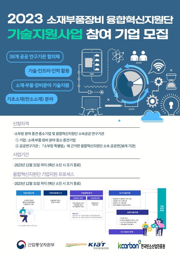 이번 소부장 융합혁신지원단 기술지원사업은 5월 2일부터 연중 상시신청 가능하며, 융합혁신지원단 기업지원데스크 홈페이지를 통해 지원 하면 된다. 기타 자세한 문의는 한국탄소산업진흥원 기업활성화실(063-219-3667)로 하면 된다.
