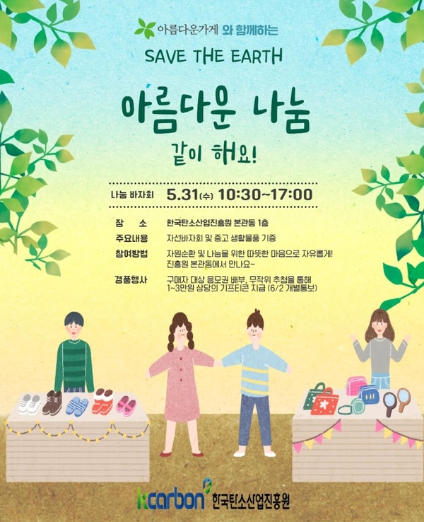 한국탄소산업진흥원(이하 진흥원)은 오는 5월 31일 아름다운가게 전북본부와 함께하는‘아름다운 하루’ 나눔 바자회를 개최한다고 밝혔다.