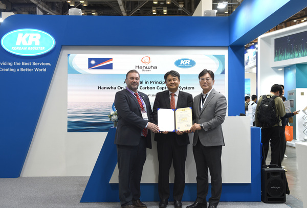 KR(한국선급, 회장 이형철)은 지난 24일부터 부산 벡스코에서 열리고 있는 코마린 2023에서 한화오션(대표이사 권혁웅)이 개발한 선박용 이산화탄소 포집장치(OCCS, Onboard CO2 Capture System)에 마샬아일랜드 기국과 공동으로 개념승인(AIP, Approval In Principle)을 수여했다고 밝혔다.