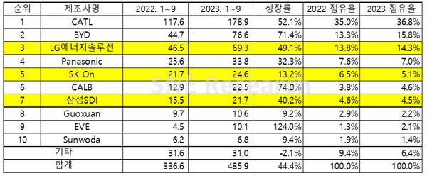 국내 배터리 3사의 점유율은 23.8%로 전년동기대비 1.1%p 하락했지만 배터리 사용량은 모두 성장세를 나타냈다. LG에너지솔루션은 전년동기대비 49.1%(69.3GWh) 성장하며 3위를 기록했다. SK온은 13.2%(24.6GWh), 삼성SDI는 40.2%(21.7GWh)성장률을 기록하며 각각 5위와 7위를 차지했다.
