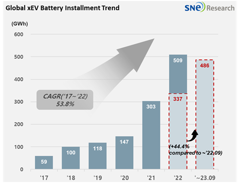 SNE리서치에 따르면 지난 1~9월 세계 각국에 등록된 전기차(EV, PHEV, HEV)에 탑재된 총 배터리 사용량은 약 485.9GWh로 전년동기대비 44.4% 성장했다. 지난 5년간 기록한 53.8%에 달하는 연평균성장률과 비교하면 둔화됐다.