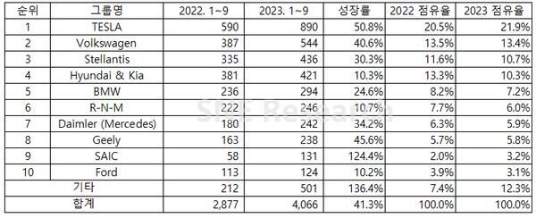 현대자동차그룹 역시 주력 차종인 아이오닉 5/6, EV6 외에도 해외시장에서 높은 인기를 나타내는 투싼·스포티지 플러그인 하이브리드 차량의 판매량에 힘입어 전년동기대비 10.3% 늘어난 42만1천대를 기록했다. 올해 역대 3분기 최고 실적을 경신한 현대자동차그룹은 전용 전기차 브랜드 ‘아이오닉’의 글로벌 인지도 제고, 하이브리드 라인업 강화를 통한 친환경차 판매 확대를 통한 점유율 확대에 집중할 방침이다.