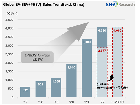 ▲ 중국을 제외한 세계 전기차 판매량 추이(자료:SNE리서치)