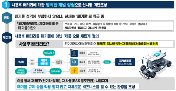 하지만 우리나라의 경우 사용 후 배터리를 단순 폐기물로 바라보고 관리하고 있으며, 사용후 배터리 관련 사업은 폐기물 관리법, 자원순환법, 자동차 관리법 등 다부처 복합규제를 받고 있어 조기 사업화에도 애로가 많다.