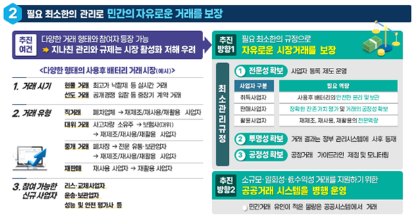 다만 시장의 공정성, 효율성 등을 담보하기 위한 최소 장치로 사용후 배터리를 확보·유통·활용하는 자의 자격 요건을 설정하였으며, 모든 거래의 결과는 정부 시스템에 등재하기로 했다.