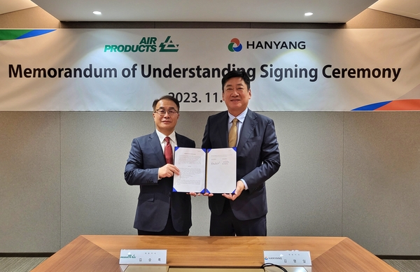 에어프로덕츠 코리아는 16일 건설·에너지 전문기업 ㈜한양과 함께 전남 여수지역(여천배후부지 등) 내 청정 암모니아·수소 인프라 구축을 위한 공동개발 협약(MOU)을 체결했다고 밝혔다. 이날 협약식에는 에어프로덕츠 코리아 김승록 대표이사와 한양 김형일 대표이사(부회장) 등이 참석했다.