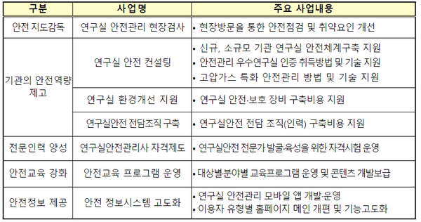 이와함께 안전보호구, 장비 등 연구실 환경 개선을 지원하는 비용과 연구실 안전관리 전문성 향상을 위한 전담조직 구축 비용도 지원된다.