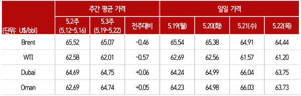 한국석유공사 석유정보센터(PISC)가 발표한 ‘5월 3주 주간 국제유가동향’에 따르면, 대서양 유종인 브렌트유 평균 가격은 전주 대비 배럴당 0.46달러 하락한 65.07달러, 미국 서부텍사스산원유(WTI)는 0.57달러 떨어진 62.01달러를 기록했다. 중동 유종인 두바이유와 오만유는 각각 0.06달러, 0.05달러 상승해 64.75달러, 64.74달러를 나타냈다.