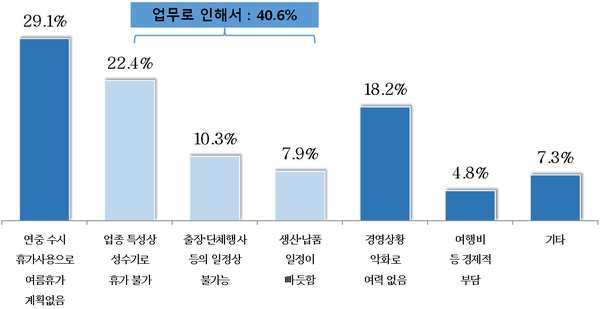 여름 휴가계획이 없는 중소기업 CEO(55%)는 그 이유로 40.6%가 ‘업무로 인해서’라고 답했으며 △‘연중 수시 휴가사용으로 여름휴가 계획 없음’(29.1%) △‘경영상황 악화로 여력 없음’(18.2%) 등이 뒤를 이었다.