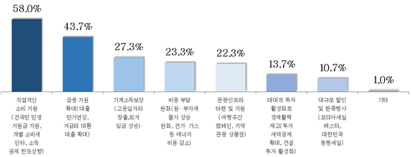 효과적인 내수 활성화 정책으로는 ‘직접적인 소비 지원(전국민 민생지원금 지원)’이 58%로 가장 높았으며, ‘금융 지원 확대(대출 만기연장)’(43.7%), ‘가계소득 보장(고용일자리 창출)’(27.3%), ‘비용부담 완화’(23.3%), ‘관광 인프라 마련 및 지원’(22.3%)등의 순으로 응답했다.