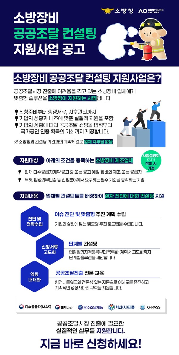 선정된 업체는 행정서류 준비, 입찰자격 등록, 규격서 및 가격 협상 자료 작성, 계약 이행 등 전 과정에 걸쳐 소방청과 사전 계약된 전문 컨설턴트의 밀착 지원을 받게 된다.