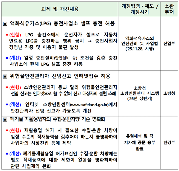 올해는 △LPG 충전소의 셀프 충전 허용 △위험물안전관리자 선임신고 인터넷접수 허용 △폐기물 재활용업자의 수집·운반차량 기준 명확화 등 9건의 신규사업자의 시장진입을 저해하거나 사업 활동을 제약하는 경쟁제한적 규제에 대한 개선안이 마련됐다.