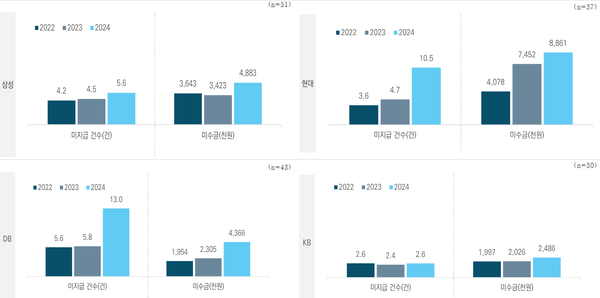 같은 기간 미지급금은 대략 △현대 7억 5,446만 원 △삼성 6억 939만 원 △DB 3억 7,088만 원 △KB 1억 9,527만 원 순으로 나타났다.