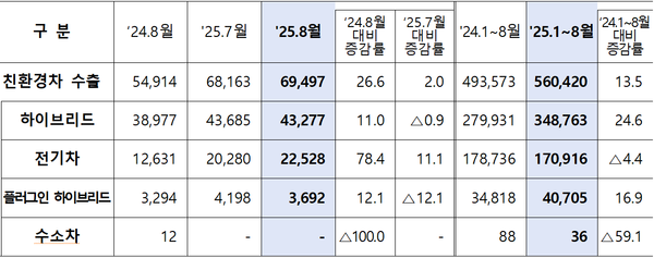 ▲ 2025년 8월 친환경차 차종별 수출 현황(단위: 대, %)(출처: 산업통상자원부)