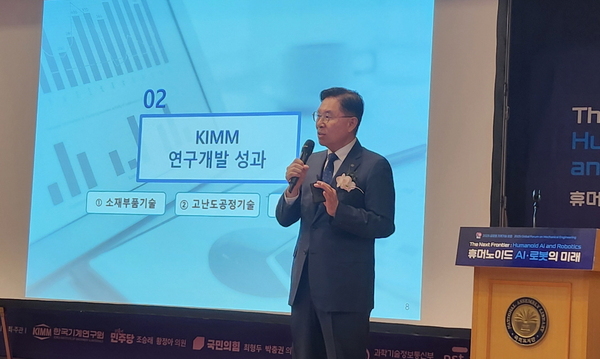 ▲ 한국기계연구원 류석현 원장이 `2025 글로벌 기계기술 포럼`에서 발표 중이다.한국기계연구원(원장 류석현, 이하 기계연)이 ’35년까지 인공지능(AI) 휴머노이드 로봇을 양산화 개발할 계획이다.