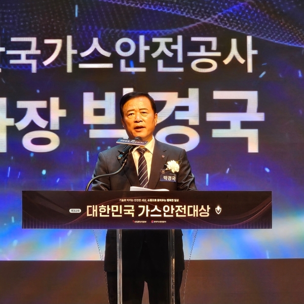 ▲ 박경국 한국가스안전공사 사장이 ‘제32회 대한민국 가스안전대상’에서 인사말을 하고 있다.이날 박경국 한국가스안전공사 사장은 대회사를 통해 “사회 전반의 디지털 전환 확산과 급변하는 에너지 환경 속에서 안전관리 패러다임의 근본적인 변화가 필요하다”며, 디지털 기반의 스마트 안전관리 확대, 수소 안전관리 강화, 탄소중립 시대의 안전 리더십 확보, 규제 혁신과 산업경쟁력 강화를 통해 글로벌 에너지안전 선도기관으로 도약하겠다는 비전을 제시했다.