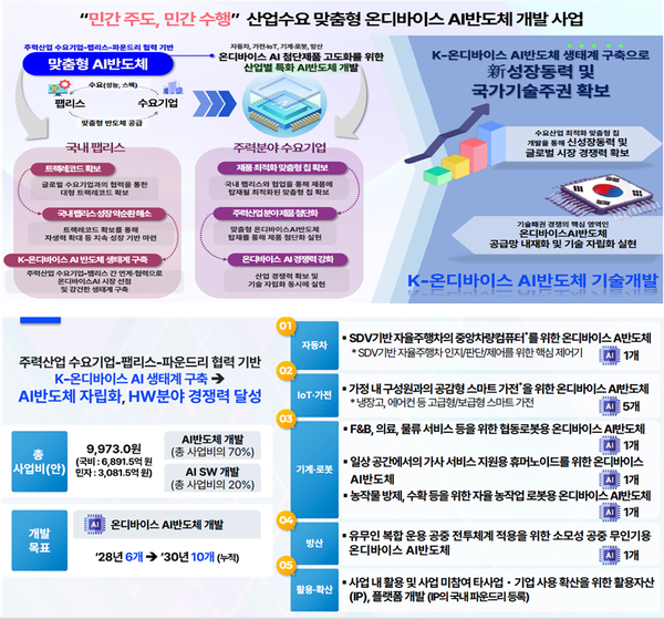 지난 8월, 4대 업종별 첨단제품 생산에 필요한 맞춤형 AI 반도체, AI SW, 모듈 등을 개발하는 1조원 규모 프로젝트가 예타 면제됨에 따라, 산업부는 적정성 검토를 거쳐 ’26년에는 수요-팹리스 컨소시엄을 중심으로 사업을 본격 착수하고, ’28년에는 국산 AI 반도체 시제품 출시 후 ’30년까지 첨단제품에 탑재될 온디바이스 AI 반도체 10개 개발을 추진할 계획이다.