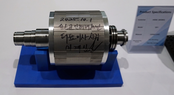 ▲ 폴란드 공장에서 생산된 첫 구동모터코어 시제품에 이계인 사장이 서명했다.