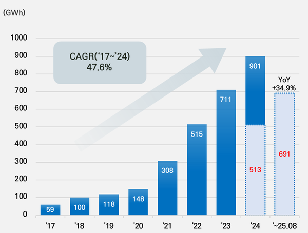 SNE리서치가 13일 공개한 보고서에 따르면, ’25년 1~8월 세계 각국에 등록된 전기차(EV, PHEV, HEV)에 탑재된 총 배터리 사용량은 약 691.3GWh로 전년대비 34.9% 성장했다.