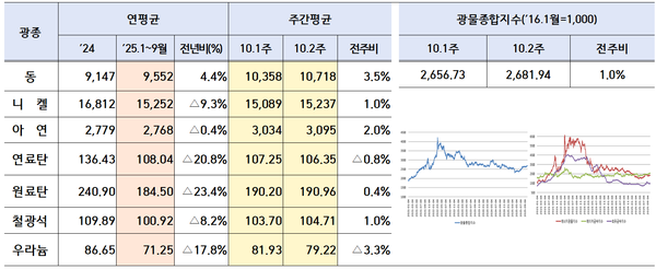 한국광해광업공단(KOMIR)이 13일 발표한 ‘10월 2주차 주요 광물가격 동향’에 따르면 광물종합지수는 ‘2,681.94’로 전주대비 1% 상승했다.