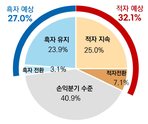 영업이익 실적이 목표치에 못 미치는 기업이 늘면서 영업수지 전망도 적신호가 켜졌다. 올해 영업이익 적자를 예상한 기업은 32.1%로, 흑자를 예상한 기업(27%)보다 많았다. 또한 지난해 흑자에서 올해 적자로 돌아선 기업 비중은 7.1%로 적자에서 흑자로 전환했다고 응답한 기업(3.1%)의 두 배를 넘었다.