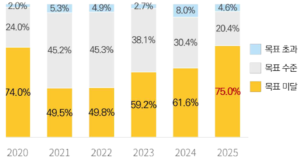 이는 코로나 팬데믹이 시작된 ’20년 이후에 진행된 조사에서 ‘목표치 미달’에 응답한 기업 비중보다도 높은 수준이다. 영업이익 실적이 올해 목표치 수준에 부합할 것으로 응답한 기업은 20.4%였으며, 목표치를 초과 달성할 것으로 답한 기업은 4.6%에 불과했다.
