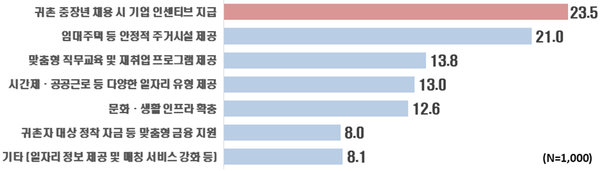 기업들은 ‘3자 연합’ 모델의 활성화를 위한 정책과제로 ‘귀촌 중장년 채용 시 기업 인센티브 지급(23.5%)’을 가장 많이 꼽았다. 이어 △임대주택 등 안정적 주거시설 제공(21%) △맞춤형 직무교육 및 재취업 프로그램 제공(13.8%) △시간제·공공근로 등 다양한 일자리 유형 제공(13%) 등의 순이었다.