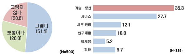 인력난을 겪는 기업(257개사)을 대상으로 조사한 결과, 인력난의 주된 직종은 △기술·생산(35.3%) △서비스(27.7%) △사무·관리(12.1%) △연구개발(10%) 순으로 나타났다.