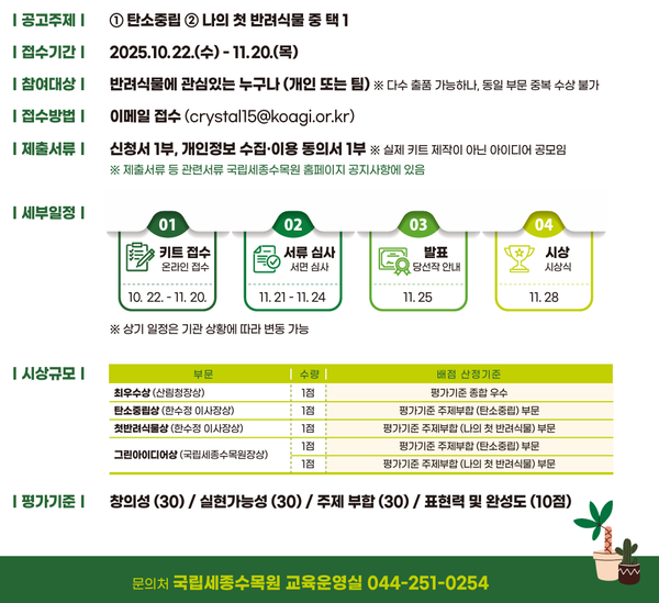심사는 창의성, 실현가능성, 주제 부합성, 표현력 및 완성도를 기준으로 진행되며, 심사 결과는 11월 28일 국립세종수목원 누리집을 통해 발표된다.