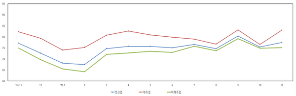 기업유형별로 일반 제조업(69.7%→71.1%)은 전월대비 1.4%p, 혁신형 제조업(72.2%→75.5%)은 전월대비 3.3%p 상승했다.