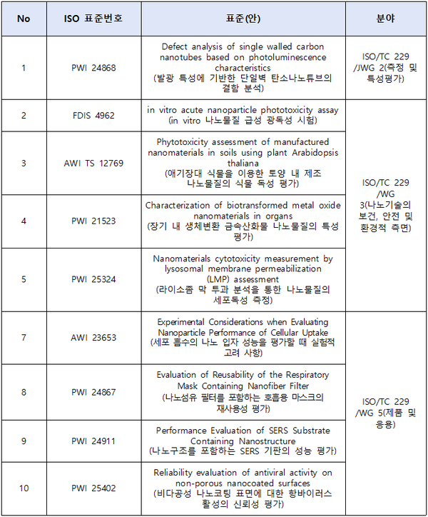 우리나라는 △나노소재 입자의 특성 평가 △나노 제품 및 응용 △나노기술의 보건 및 안전성 평가 관련 분야에서 총 10건의 국제표준을 개발하고 있다.