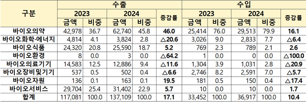 바이오 수출은 기존 주력 수출품목(항체의약품·바이오의약품 CMO 등)의 증가로 전년대비 17.1% 상승했다. 그중 바이오의약 분야는 전년대비 46% 증가해 전체 수출 증가를 견인했고, 바이오서비스(5.7%↑)와 바이오식품(5.2%)도 성장세를 보였다.