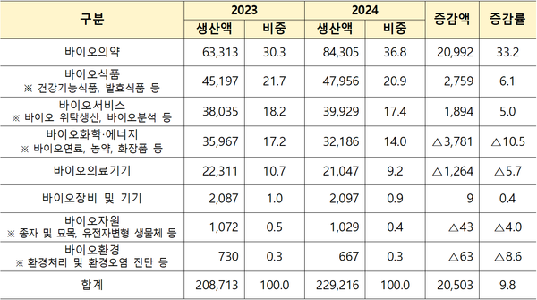 ▲ `23~`24년 바이오산업 생산규모(단위: 억원, %)(출처: 산업통상부)바이오기술이 의약품·식품 분야를 넘어 산업 전반으로 확산되고 있는 가운데, 국내 바이오산업이 바이오의약품 분야의 호조로 성장세를 회복 중인 것으로 조사됐다.