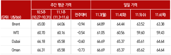 한국석유공사 석유정보센터(PISC)가 발표한 ‘11월 1주 주간 국제유가 동향’에 따르면, 대서양 유종인 브렌트유는 전주 대비 배럴당 0.94달러 하락한 64.06달러를 기록했다. 미국 서부텍사스산원유(WTI) 역시 0.54달러 떨어져 60.16달러로 집계됐다.