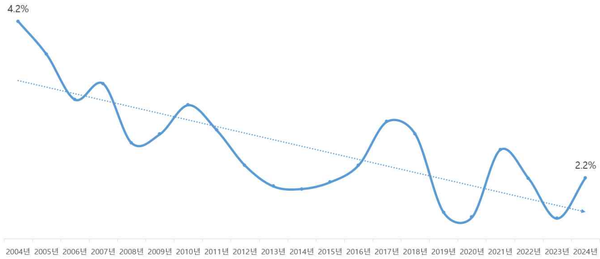 보고서에 따르면 ’04년만 해도 자산 1억원으로 420만원의 수익을 남겼으나 ’24년 기준으로는 220만원에 그친다. 이는 총자산영업이익률(ROA, Return On Asset)이 4.2%에서 2.2%로 크게 떨어졌다는 것을 의미한다. 총자산영업이익률은 영업이익을 총자산으로 나눈 지표로, 기업이 자산을 얼마나 효율적으로 활용해 수익을 냈는지를 단적으로 보여준다.