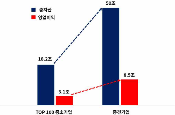 ’24년 이들 기업의 평균 총자산영업이익률은 17.1%로 자산합계 18.2조원을 활용해 3.1조원의 이익을 창출하고 있지만, 정책지원을 통해 중견기업(자산규모 5천억원)으로 성장한다면, 50조원 규모의 자산으로 8.5조원의 수익을 벌어들일 수 있다는 계산이다.
