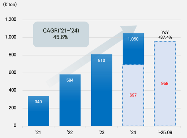 그 밖에 △Kaijin(10만 2천톤) △Shangtai(10만 1천톤) △Shinzoom(7만 5천톤) △Zichen(7만톤)도 상위권에 이름을 올렸고, 모두 전년 대비 두 자릿수 성장률을 기록하며 존재감을 확대하고 있다.