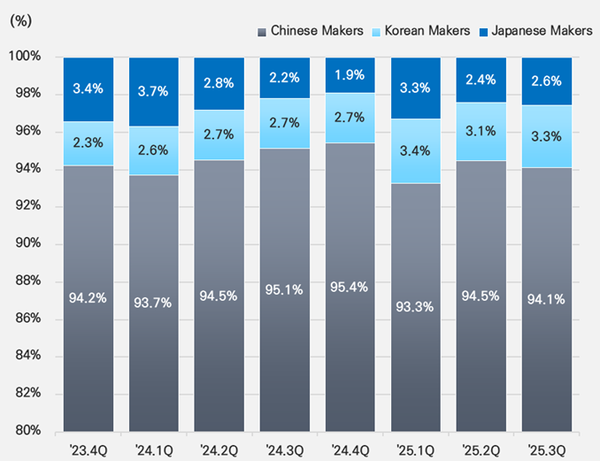 법인 국적별로는 중국 기업이 전체의 94% 이상을 차지해 절대적 우위를 굳히는 모습이다. 생산능력 확충과 기술 고도화를 바탕으로 지배력이 더 공고해지고 있으며, 전기차 시장 확장과 함께 실리콘 복합 음극재(Si-Anode) 채택이 늘어나면서 주요 배터리 제조사와의 협업도 강화되는 추세다.
