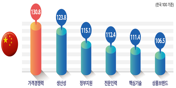중국을 최대 경쟁국이라고 답변한 기업을 대상으로 조사한 결과, ’25년 현재 한국 대비 중국의 분야별 경쟁력은 △가격경쟁력(130.7) △생산성(120.8) △정부지원(112.6) △전문인력(102) △핵심기술(101.8) △상품브랜드(96.7) 순으로 높게 나타났다.