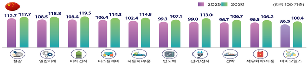 반면 △반도체(99.3) △전기·전자(99) △선박(96.7) △석유화학·석유제품(96.5) △바이오헬스(89.2) 등 5개 업종은 한국의 경쟁력이 높은 것으로 조사됐다. 하지만 5년 뒤인 ’30년에는 10개 주력업종 모든 분야에서 중국의 경쟁력이 한국보다 높아질 것으로 전망됐다.