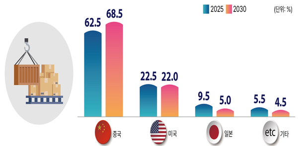 보고서에 따르면, 기업들은 ’25년 현재 수출 최대 경쟁국으로 중국(62.5%)을 가장 많이 꼽았고 다음으로 미국(22.5%), 일본(9.5%) 등의 순으로 응답했다.