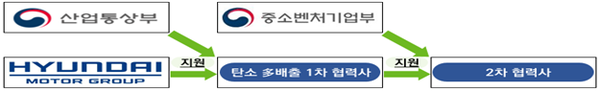 이번 협약을 통해 산업부와 현대차·기아가 우선적으로 1차 협력업체의 탄소감축 설비교체를 지원하고, 해당 1차 협력업체는 지원받은 금액만큼을 환원해 중기부와 함께 다시 2차 협력업체의 설비교체를 지원한다. 이와 같은 자동차 공급망에서의 ‘연쇄적 탄소 감축 효과’를 통해 민관이 함께하는 상생형 탄소 감축 지원체계가 구축될 것으로 기대된다.