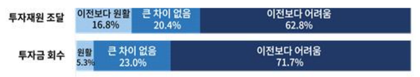 ‘투자금 회수’ 역시 ‘과거보다 어려워졌다’는 응답이 71.7%에 달한 반면, ‘과거와 비슷’(23%)하다거나 ‘과거보다 원활’(5.3%)하다는 응답은 28.3%에 그쳤다.