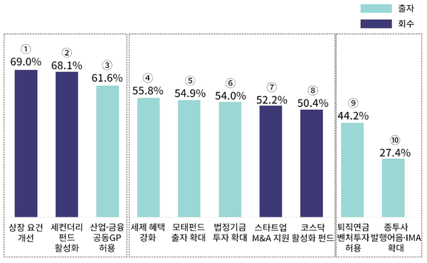 이외에도 △벤처투자에 대한 세제혜택 강화(55.8%) △모태펀드 출자 규모 확대(54.9%) △연기금 등 법정기금의 벤처투자 확대(54%) △퇴직연금의 벤처투자 허용(44.2%) 등, 투자재원 확대를 위한 제안과 ‘스타트업 M&A 지원’(52.2%), ‘민관 코스닥 활성화 펀드 조성’(50.4%) 등 회수시장 원활화를 위한 방안들이 주요 과제로 지목됐다.