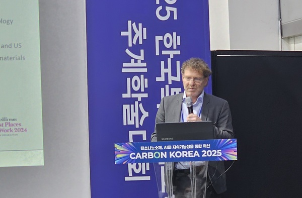 ▲ 마르쿠스 루멜 레비디안 유럽 영업이사가 ‘카본코리아 2025’에서 그래핀 기반 배터리 활성물질(BAM) 캡슐화 기술에 대해 설명하고 있다.오늘날 소재 산업은 성능 격차와 공급망 취약성, 탄소 집약적 생산 방식으로 혁신이 제한되고 있는 가운데, 영국 첨단 소재 기업 레비디안(Levidian)이 메탄에서 고품질 그래핀을 생산해 배터리와 산업 소재에 적용, 성능과 안정성을 동시에 강화하며 지속가능한 산업 혁신을 현실로 만드는 새로운 길을 열었다.