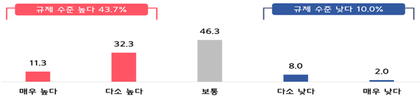 조사 결과, 중소기업의 43.7%가 현 규제 수준이 ‘높다’고 평가해 ‘낮다’는 응답(10%)보다 높은 것으로 나타났다. 규제가 기업경쟁력에 미치는 영향에 대해서도 ‘부정적’이라는 응답이 48.3%로 ‘긍정적’이라는 응답 7%보다 높게 조사됐다.