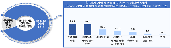 규제가 기업경쟁력에 부정적 영향을 미친다고 답한 기업들은 그 이유로 ‘고용 확대 제한’(29.7%)과 ‘원가상승·가격경쟁력 하락’(29%)을 가장 많이 꼽았으며, 이어 △생산성 저하(15.2%) △신사업·신기술 진출 및 개발 제약(11%) △투자 축소·지연(9%) 순이었다.